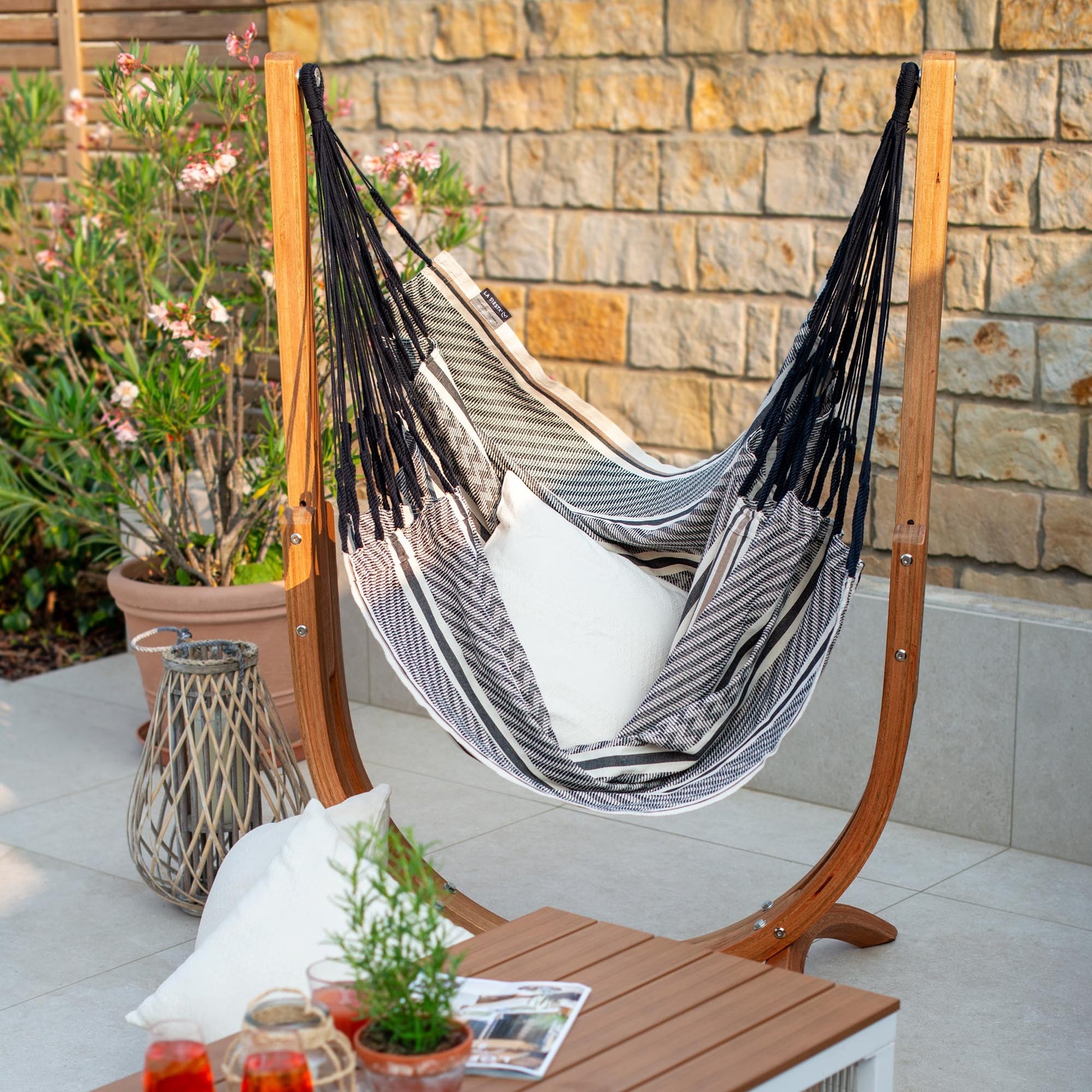 Η καρέκλα αιώρα είναι χειροποίητα υφασμένη από βιολογικό βαμβάκι με πιστοποίηση GOTS , με εκλεπτυσμένα μοτίβα και φυσικούς τόνους που σας βυθίζουν στη χαρά και τη γαλήνη μόλις καθίσετε.