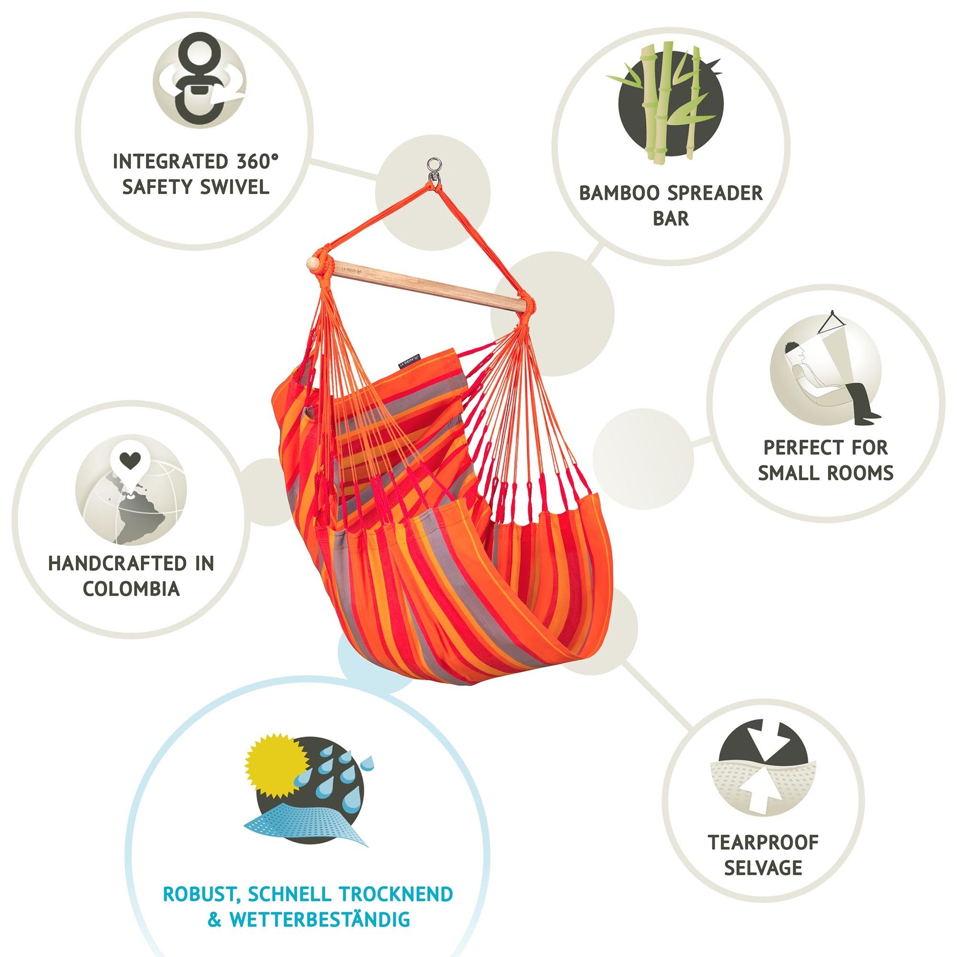 Οι αιώρες-καρέκλες Κολομβίας αντικατοπτρίζουν την ποικιλομορφία και την ενέργεια της Νότιας Αμερικής. Η Domingo υφαίνεται και κατασκευάζεται στο Μεντεγίν της Κολομβίας.