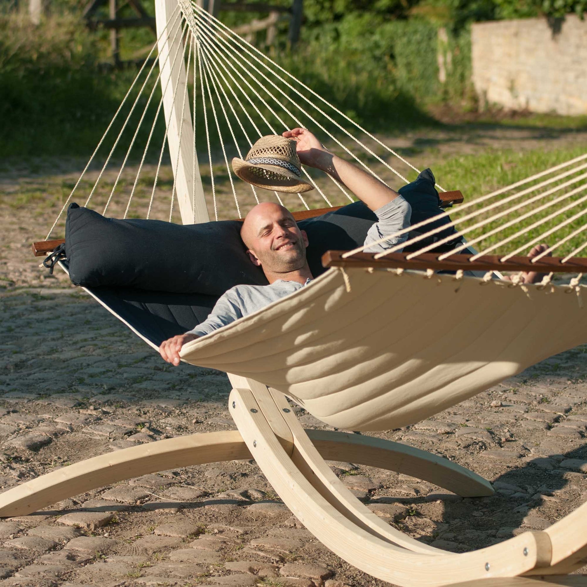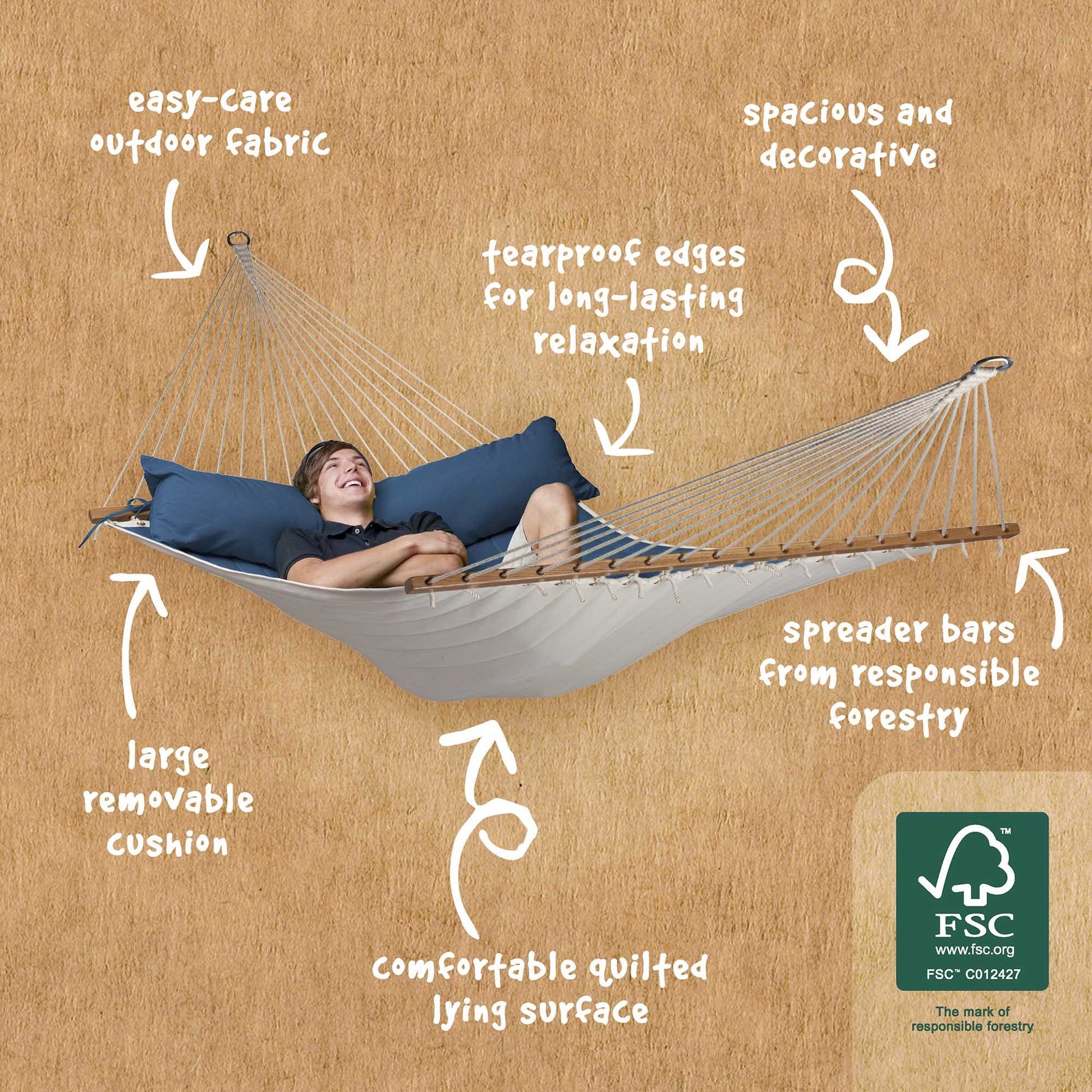 Η αιώρα έχει ένα ενσωματωμένο μαξιλάρι που παρέχει πρόσθετη άνεση και μπορεί να αφαιρεθεί εύκολα οποιαδήποτε στιγμή. Το ξύλο της ράβδου είναι υψηλής ποιότητας, εξασφαλίζοντας στην αιώρα αντοχή στον χρόνο.