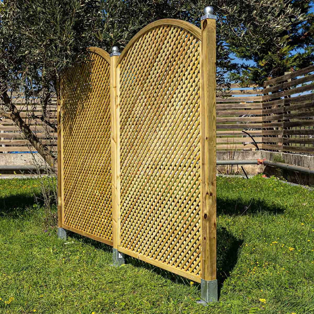 Το καφασωτό Διαμάντι Αψίδα 2 x 2εκ. είναι κατασκευασμένο από εμποτισμένο σκανδιναβικό πεύκο. Αποτελείται από εξωτερικό πλαίσιο διατομής 4,5 x 4,5εκ. και εσωτερικά από πηχάκια διατομής 0,8 x 2εκ.