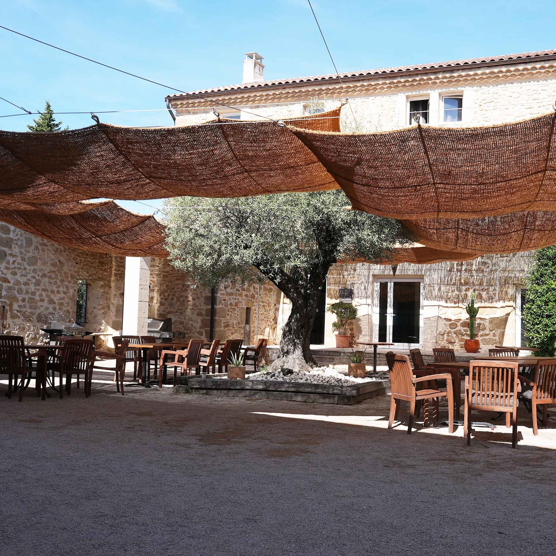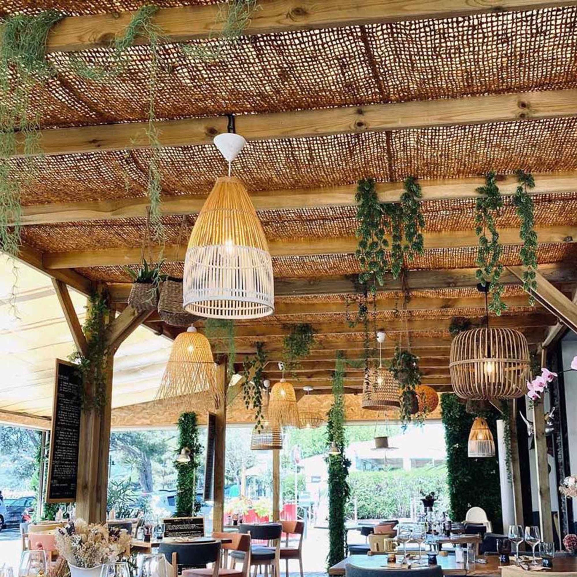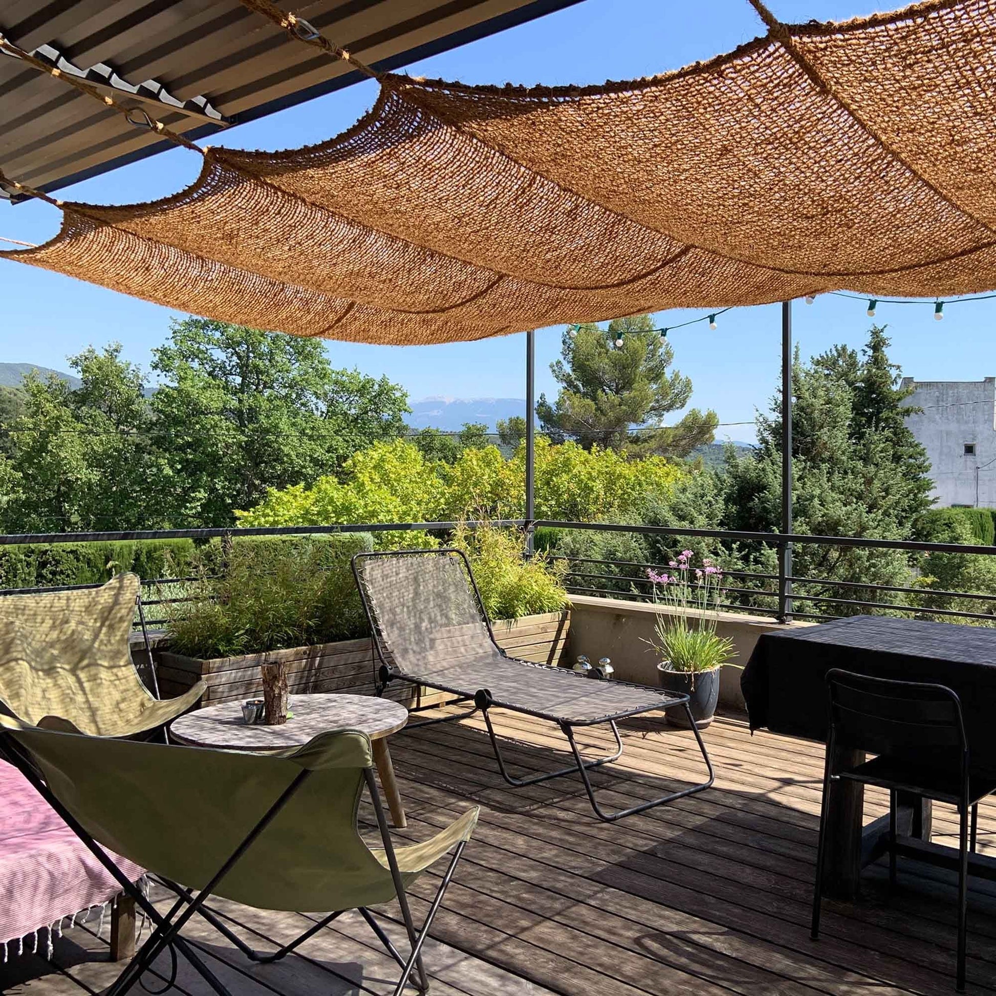 Μπορούν να μείνουν σε εξωτερικούς χώρους όλο το χρόνο. Οι ίνες καρύδας είναι φυσικά ανθεκτικές στη σήψη και πολύ στιβαρές. Τοποθετημένα σε μια υπάρχουσα σταθερή κατασκευή ή αναρτημένα, τα πανιά σκίασης μπορούν επίσης να χρησιμοποιηθούν κάθετα για απομόνωση του χώρου.
