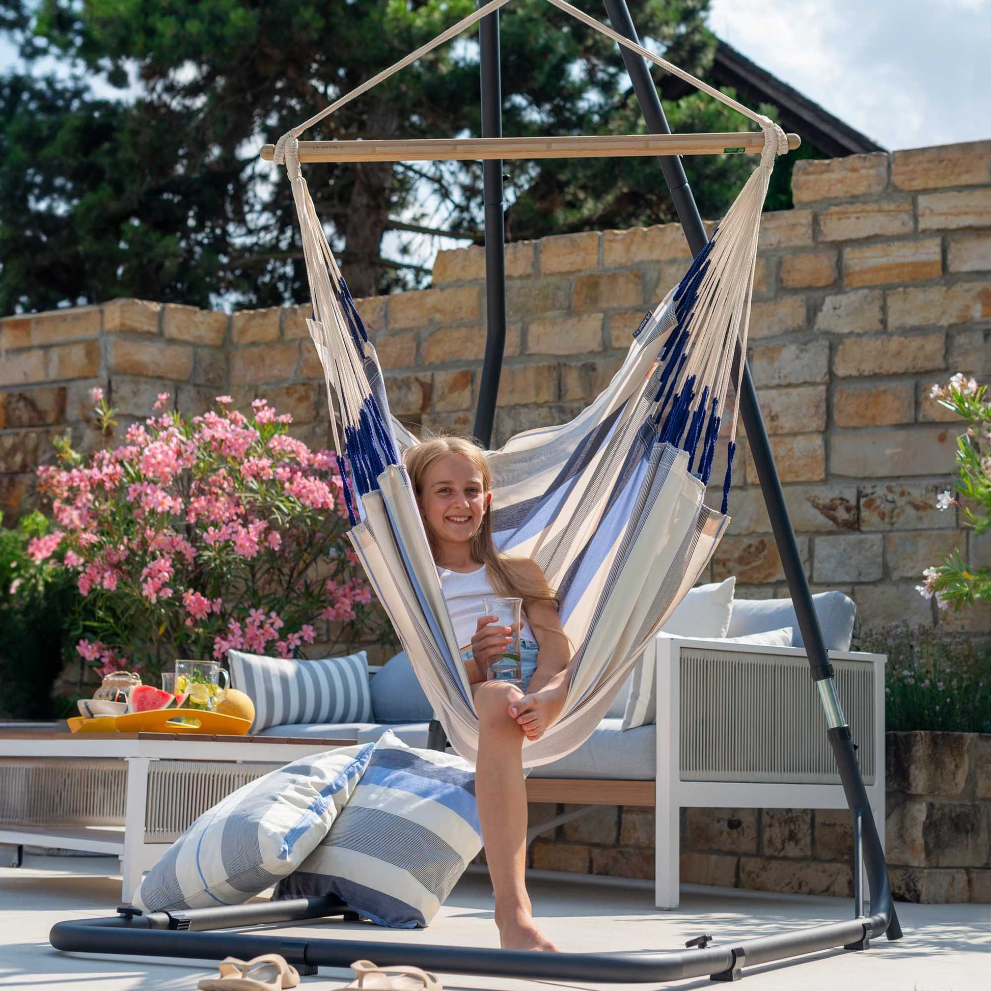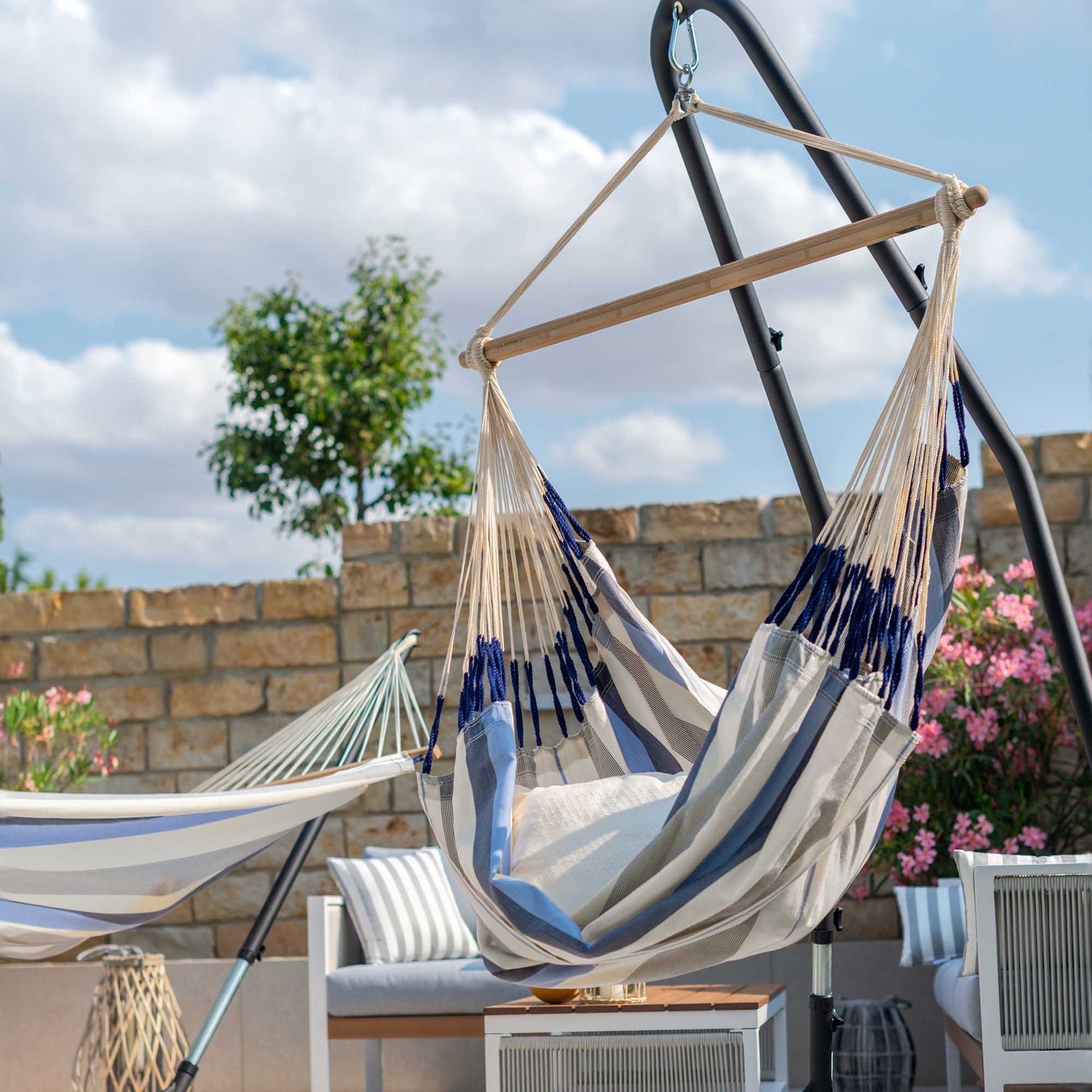 Η εύκολη ρύθμιση του ύψους καθιστά αυτή τη βάση κατάλληλη για αιώρες LA SIESTA όλων των μεγεθών.