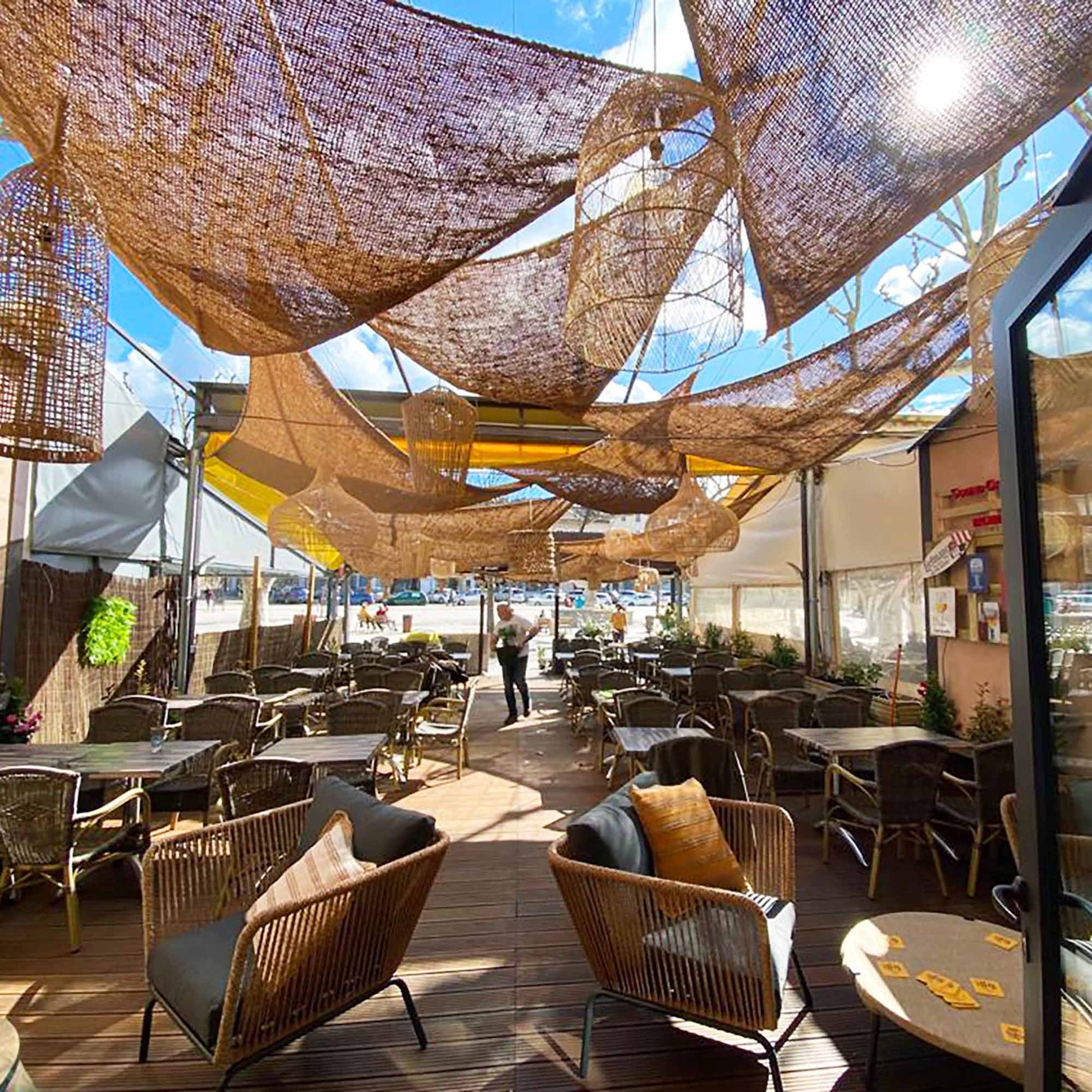 Μπορούν να μείνουν σε εξωτερικούς χώρους όλο το χρόνο.Οι ίνες καρύδας είναι φυσικά ανθεκτικές στη σήψη και πολύ στιβαρές. Τοποθετημένα σε μια υπάρχουσα σταθερή κατασκευή ή αναρτημένα, τα πανιά σκίασης μπορούν επίσης να χρησιμοποιηθούν κάθετα για απομόνωση του χώρου.