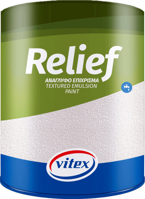 Ανάγλυφο πλαστικό χρώμα εξωτερικής χρήσης με βάση συμπολυμερείς ρητίνες PVA-VEOVA. Έχει μεγάλη καλυπτικότητα και εξαιρετική αντοχή στην υγρασία και τις δυσμενείς ατμοσφαιρικές συνθήκες. Απλώνει πολύ καλά χωρίς να αφήνει ματίσεις και αποκτά μεγάλη σκληρότητα, χωρίς να σκάει. Με Relief της Vitex βάφονται επιφάνειες από οποιοδήποτε υλικό μετά από κατάλληλη προεργασία.