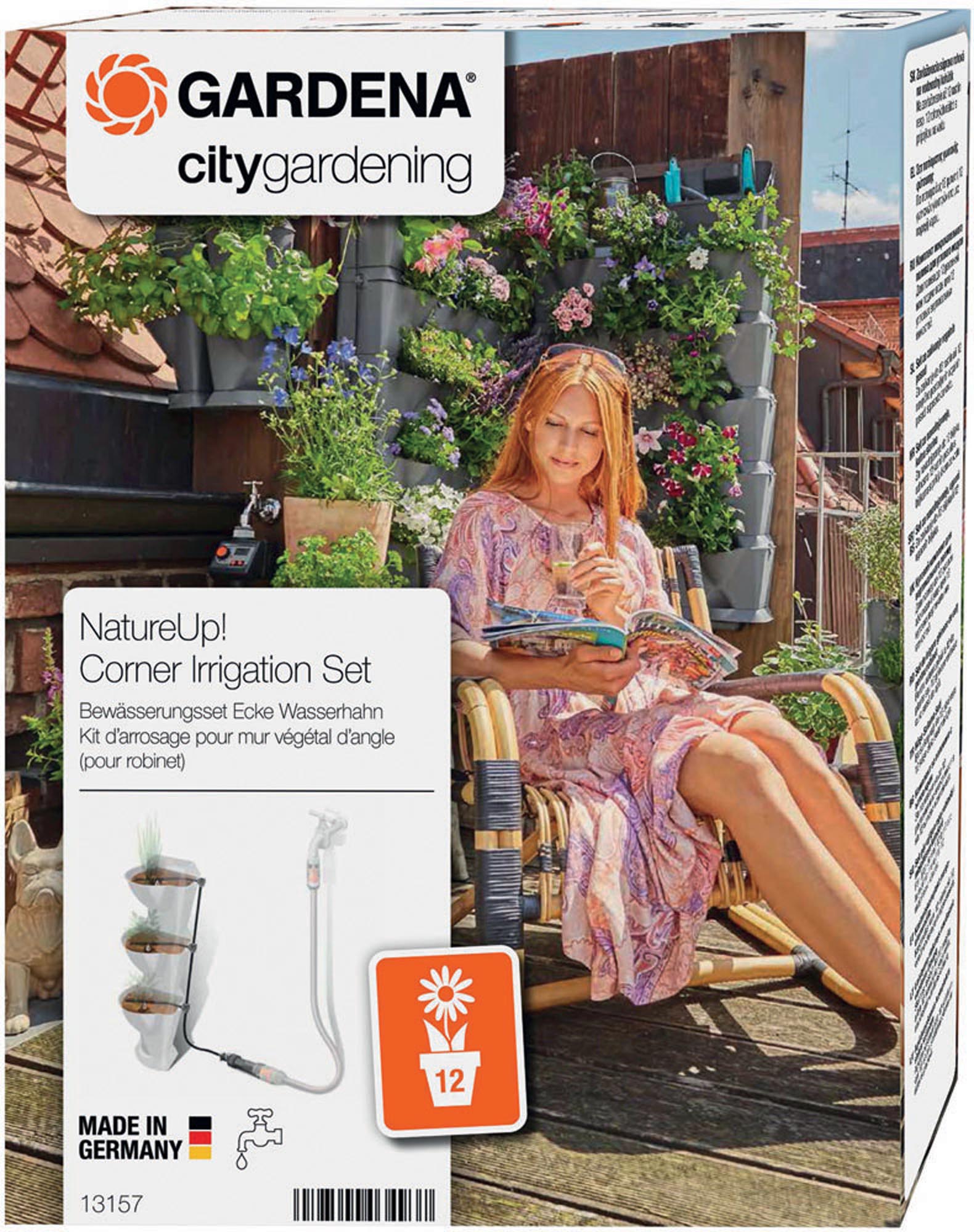 Το Σετ Ποτίσματος Κάθετης Φύτευσης της GARDENA περιλαμβάνει όλα τα υλικά για πότισμα έως και 12 κάθετων θηκών με εξοικονόμηση νερού. Η μονάδα μείωσης πίεσης συνδέεται με τη βρύση με τον σύνδεσμο. Οι κάθετες γλάστρες ποτίζονται με ακρίβεια με πότισμα σταγόνας μέσω του συστήματος σωλήνων.