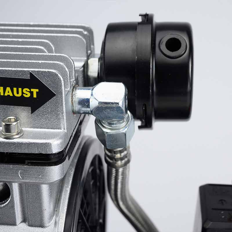 Αεροσυμπιεστής χαμηλού θορύβου με κινητήρα χωρίς λάδι. Με δύο μανόμετρα για ένδειξη πίεσης αέρα