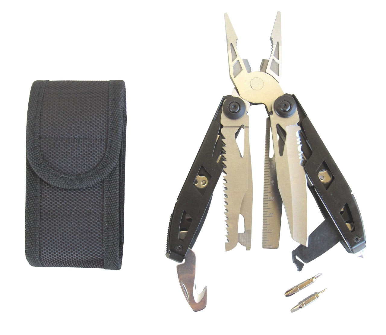 Περιέχει πένσα, αιχμηρό μαχαίρι, πριόνι, κόφτη σύρματος, απογυμνωτή καλωδίων, ανοιχτήρι κονσερβών, ανοιχτήρι μπουκαλιών, γερμανικά κλειδιά, λίμα, χάρακα, μαγνητικό προσαρμογέα κατσαβιδιών με 2 κατσαβίδια διπλής όψης, εργαλείο θραύσης τζαμιών, κόφτη ζώνης αυτοκινήτου, σύστημα ασφάλισης εργαλείων και θήκη ζώνης.